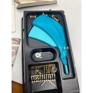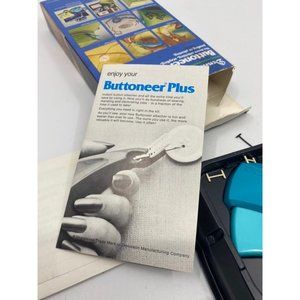 Includes the Box and instruction sheet. Includes the Buttoneer, and two small circles which I take to be the one-hole buttons. Also some fasteners, but new fasteners will need to be added. The hole sizer doesn't seem to be in the box.