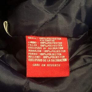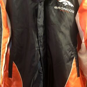 Vintage Denver Bronco’s NFL warm winter hooded jacket. Quilted lined. Lining and filling is polyester. Shell is polyester. Full zip and hook and loop closure. Pockets. Fleece lined hood. Elastic hem and cuffs. Preowned EUC