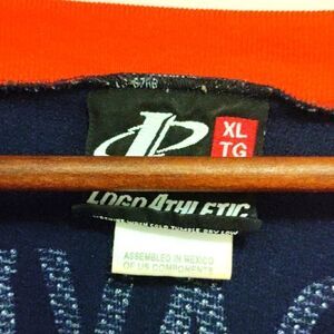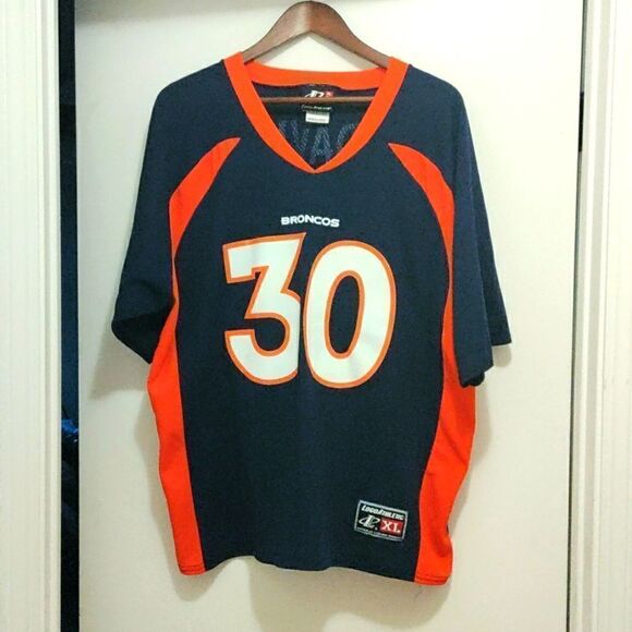 Navy blue, orange, and white vintage Denver Broncos Terrell Davis jersey. In very good condition, no major flaws. See photos for details. W 25" L 27"