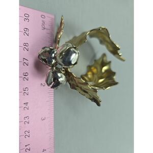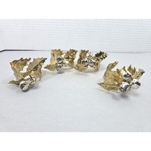 Set of 4 Gold Color Holly Leaf shaped napkin rings with attached silver tone bells as berries.