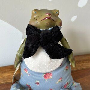 Charming, vintage Department 56 shelf-sitter frog doll designed by artist Marylisa Chesnutt and made in Thailand. This whimsical frog has a fabric body that's filled with something that gives it a beanbag-feel. The head and limbs are hand-painted ceramic, and the bow is velvet-like – super cute! This would be a fun and unique decor piece for spring and summer.