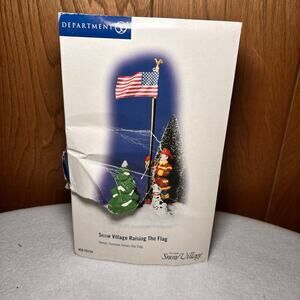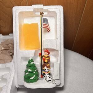 Celebrate American spirit with this Vintage Department 56 Snow Village “Raising The Flag” collectible. This charming figurine depicts a heroic firefighter raising the American flag alongside a Dalmatian and snowy evergreens. A perfect addition to your Snow Village display or patriotic holiday décor.