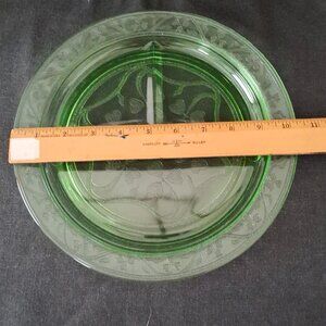 Vintage glassware, Depression Glass, transparent green, Cloverleaf pattern by Hazel Atlas, 10 1/4" diameter divided plate, 3 part grill plate. Cloverleaf garland vine runs around rim and again in the center of the plate. Vintage item in good condition, no chips, no cracks, light use.