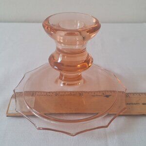 Vintage candlestick, candle holder. Depression Glass, transparent pink colored glass. Approximately 5 inches in diameter at base, 3 1/2 inches tall. Vintage item in good condition, few small light scratch/use marks, no chips.
