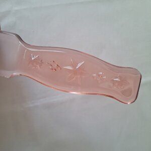 Vintage 1930s 1940s Depression era glass cake knife, fruit knife, transparent pink glass, approximately 9 inches long overall. The handle has an in-mold decoration of a large star in the center, a smaller star at the top and bottom, the three stars being separated by two diamonds, each of which are composed of four smaller diamonds. Vintage item in good condition, light nicking on blade knife from use, no cracks, no major chips.