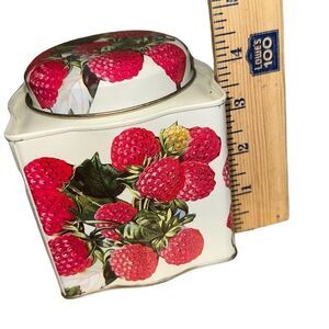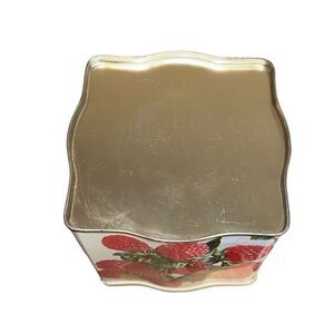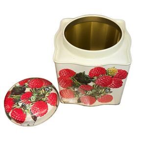 Vintage Dept 56 Decorative Tin Square Raspberry White/ cream With Red Berries.