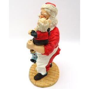 This Department 56 Santa Toymaker figurine is approximately 5.5 inches tall. Santa is depicted holding a small elf doll, while another doll hangs from his apron playing a trumpet. Base is covered in green felt with a © Dept 56 label.