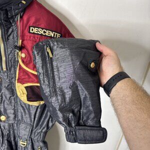 Official supplier to the Suisse Ski Team. Rare retro Descente one-piece ski suit from the 1980s/1990s featuring bold color blocking, multiple zip/snap pockets, heavy-duty zippers, waist cinch, and embroidered logos. Tag size 48, fits Men’s Small. Made in Hong Kong. Collectible and highly desirable in pristine condition.