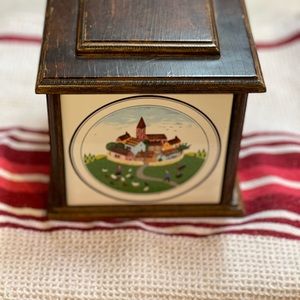 Rare vintage storage box with two Design Naïf scenes on ceramic tiles.