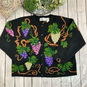 A gorgeous 1990’s cardigan featuring grapes on vines with beadwork throughout.