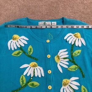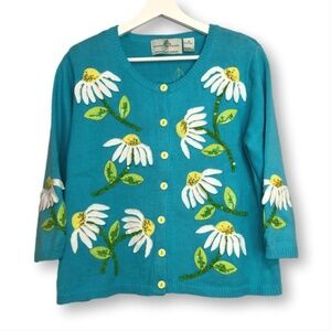 Design Options by Philip & Jane Gordon vintage button-front cardigan sweater with a blue daisy design.