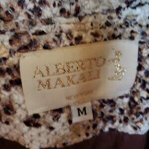 Vintage 1980’s, Designer Alberto Makali. Size Medium. This design is brown, bronze, and cream and animal look(no actual animals on print). The Couture Fabric of Jacket is 100% polyester and lined(beautiful). It has the crinkle look. It has an open front and high low style. Looks great with skirts or jeans. Still very stylish! Mint Condition.