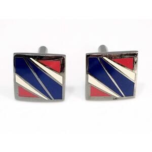 *Description: Beautiful square shaped enamel cuff links by Joseph Abboud, vintage from the 1990s. These patriotic cuff links are on a gun metal tone with a blue stripe from corner to corner, outlined with a white thin triangle and the outside corners are a red long triangle. The red, white, and blue enamel on gunmetal gray make for a good looking pair of vintage cuff links.