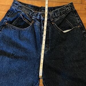 Heavy cotton denim, High waisted , tapered legs , 5 pocket with off set back pockets, 2 button fly front, Belt loops.