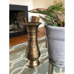 This is a stunning brass vase found at a Worcester, MA. thrift store. It is brass and features a etched floral design throughout. It is of great craftmanship- a beautiful piece of art!