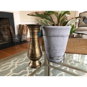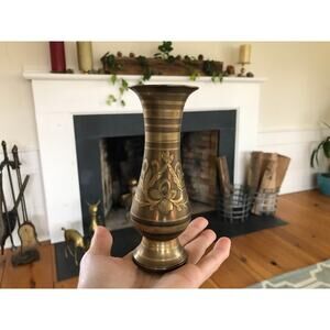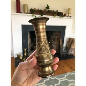 Vintage Designer Etched Brass Vase, Floral Brass Vase, Art