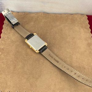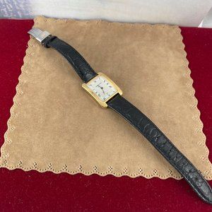 Vintage Designer Gold Daniel Mink Swiss Made Watch, Almost New. Elegant Styled Curvature "Boutique" Tank Watch 18 Kart Gold Plated, Guilloche Enamel Dial with Roman Numerals Black Hands and Accents Date at 6 O'clock Clean Mineral Crystal. Water resistant to 100 Meters with 8 inch Black Embossed Leather Strap With Daniel Mink Buckle Case is is 1.125 x 0.925 inch, stainless steel Back. High Quality Watch from the 80s by Danial Mink High End Swiss 7 Jewel Movement new battery