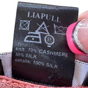 Material is 70% cashmere, 30% silk with 100% silk in the back, hand wash