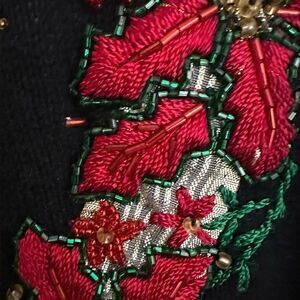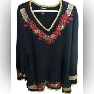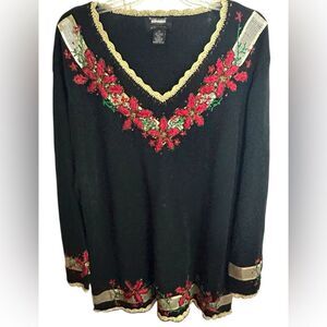 VTG Designers Original Studio Womens plus size 2XL Christmas Sweater Poinsettias. Embellished with beads with embroidered flowers. 1990s Vintage Floral Holiday with Black, Red,Green,and Gold colors.