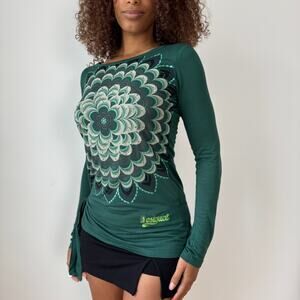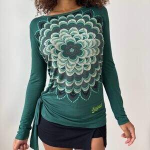 Vintage Desigual Green Mandala Print Viscose Long Sleeve Top with Side Tie (S/M)