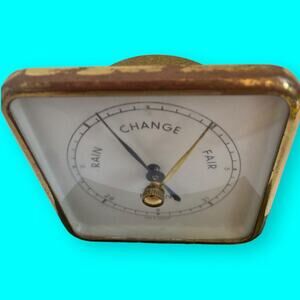 Vintage Desktop Weather Station FLORN, Made In Germany. This little desktop weather station would make a great Father’s Day present. It is brass with a green Marble Base. Plaque on front reads Thanks 100 Million Power Distribution Division. The needles move a little, but not much, so I don’t know if it works or not. The last photo that I took on a different date and just added definitely shows the needles in different positions. No guarantees on functionality. A really interesting paperweight/desktop decoration.