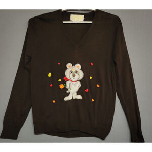 Vintage Di Costa Sweater Womens L Brown Embroidered Bear V-Neck Long Sleeves 70s