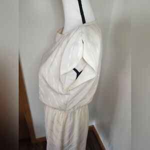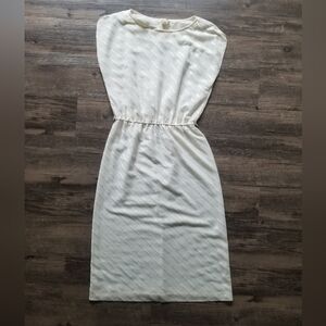 Vintage Diagonal Striped Dress, good pre worn condition, gentle wear throughout, no rips, structurally sound, size 12 the tag says, I normally year a medium/large size 10 and it fits snug, hugs the curves, 60s 70s, vintage retro, will need slip, cream colored, recently laundered hung to dry, petal sleeve opening, belt loops, 100% polyester