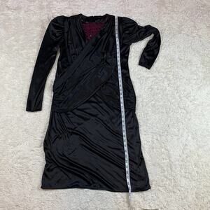 Designed by Wayne Diamond, this little black dress features a drape wrap style bust over sequin underpayment, a sheath fit, and Victorian puffed long sleeves. Dress has ample stretch and a back zip closure, no pockets.