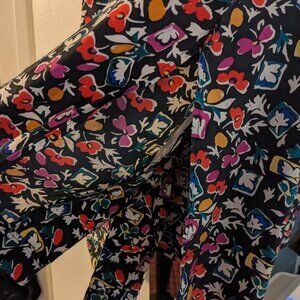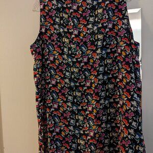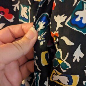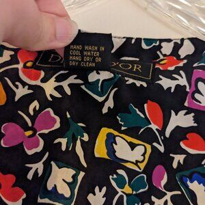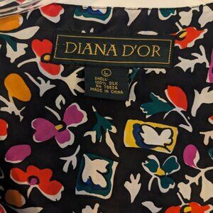 Vintage 100% silk sleeveless top from Diana D'or featuring a floral pattern. This top is fairly long and has a slit up the sides. Very tunic like! It buttons all the way down the front, and has little snaps in between the buttons which I thought was extra nice. Size L. I wear a L or XL in most modern clothing and this fit me comfortably.