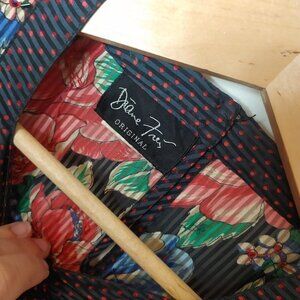 One of a kind, in great condition, stunning 80’s vintage Diane Freis with attached tie waist sash, buttons in back of neck, floral beadwork. Shoulder pads, detailed neckline and slit pattern sleeves.