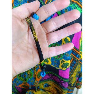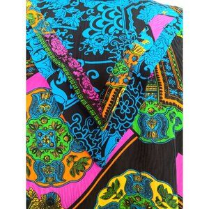 Elevate your wardrobe with this Diane Freis Georgette blouse. Featuring a vibrant peacock paisley print and elegant ruffles, it's perfect for any occasion. Lightweight and stylish, this blouse offers a flattering fit and timeless design. It measures 25" in length from the top seam of the shoulder to the bottom hem and 20" from pit to pit. It has tassels with a bead at the bottom.