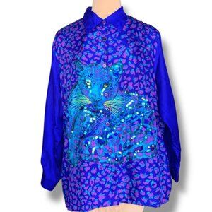 Vintage Diane Gilman Silk Leopard Animal Print Sequin Sheer Blouse Electric Blue