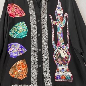 Vintage Diane Von Furstenberg Top Shirt Medium 100% Silk Tea Cup Art To Wear