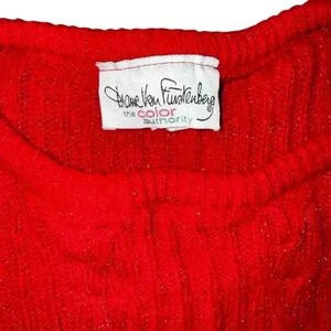 Upgrade your wardrobe with this stunning Vintage Diane Von Furstenberg sweater. The perfect combination of style and comfort, this sweater is a must-have for any fashion-forward individual. Its vibrant red color and metallic accents make it a standout piece that will elevate any outfit.