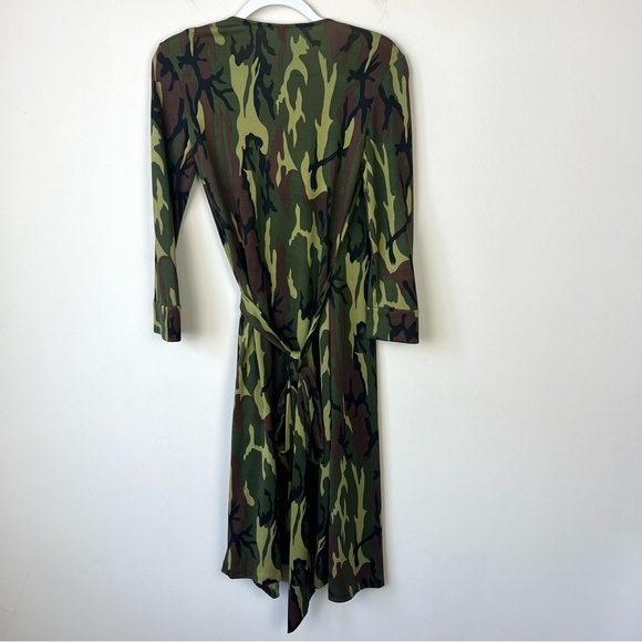 Vintage Diane von Furstenberg 100% Silk Camo Print Midi Wrap Dress. a couple of tiny pulls, shown in pics, overall in great lightly used condition!