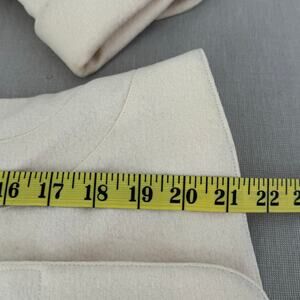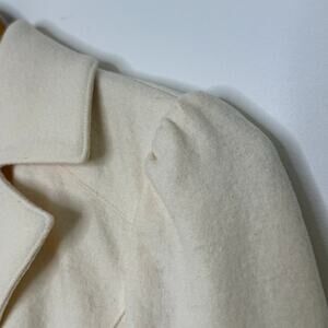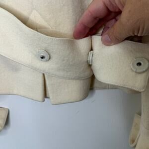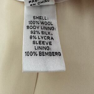 Vintage Diane von Furstenberg Blazer. 100% wool. Silk and lycra lining. Snap front closure. Belted back. Cuffed sleeves. Cuffs partially untacked. Fully lined. Small stain on inside lining. Beautiful cream color.