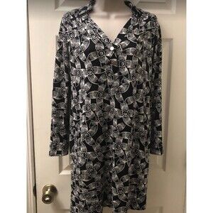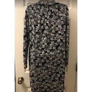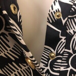 Vintage Women's Silk Diane von Furstenberg Collared Slip On Dress Size 4. Dress is vintage pre-owned. Please see all photos for visible condition. doesn't look worn much at all. No lining no belt (not sure if a belt even came with this). Floral geometric black and off white pattern. V neck - 2 snaps. 2 side hand pockets. Snaps on wrists. Approximately 20.5 inches pit to pit 22 inches arm length and 33 inches long. Shell 100% silk. Trim 70% trim 30% viscose. There are a couple minor makeup spots inside collar - see photo by tag. Only one available - the one photo is of front and back. Dress would look nice with or without a belt (Not included).