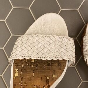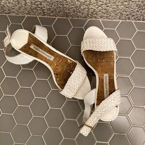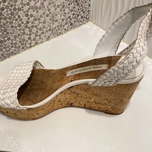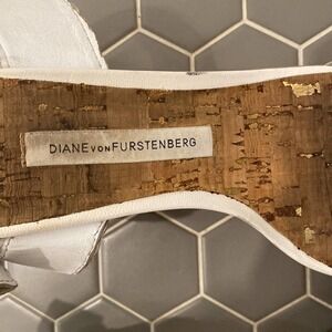 Vintage Diane von Furstenberg white wedges with ankle straps. Cork foot bed and wedges with gold flecks. Great preowned condition. Small flaw in the foot bed size of a dime where foot bed is worn hidden under front band. 4”heel. Size 7 1/2