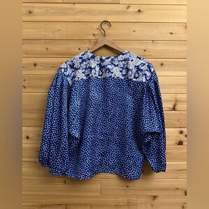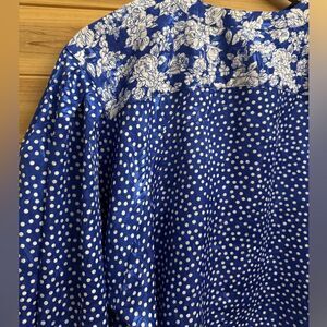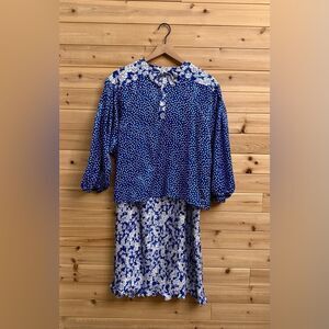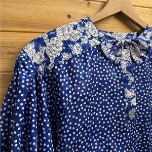 Royal Blue Polka Dot Top & Bow Detail At Neckline With Midi Pleated Floral Print Skirt. No Holes Or Stains Found
