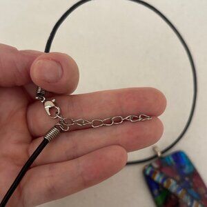 Vibrant dichroic fused glass statement pendant with beautiful abstract design. Features blue, red, green, and gold colors. Unique and artistic style. Black cord. Silver-toned adjustable extender attached. Preowned.