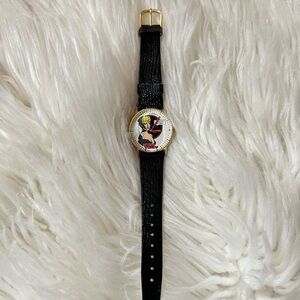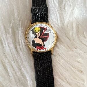 Watch image is of a woman with the caption saying, I ALWAYS GET MY MAN'. Black watch band, Adjustable with numerous holes for right wrist sizing/hold.watch is in really good shap
