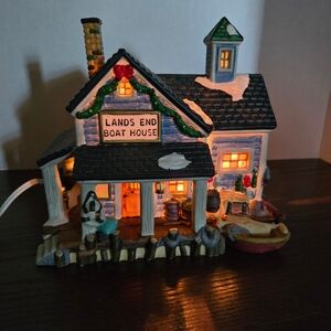 This vintage collectible is a 1997 Dickens Village piece from Lands' End Towne Series, featuring a Boathouse as part of a Christmas village theme. Made of porcelain in a multicolor design, this decorative item showcases a nautical style within the seasonal collection. The collectible is part of the Dickens Village series and represents a late 20th-century era piece with a unique all-over pattern, perfect for holiday enthusiasts or collectors of Christmas villages.