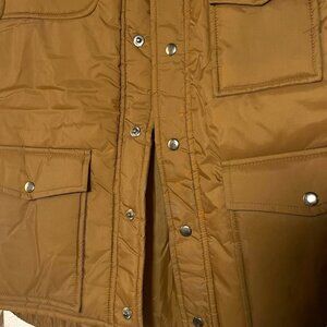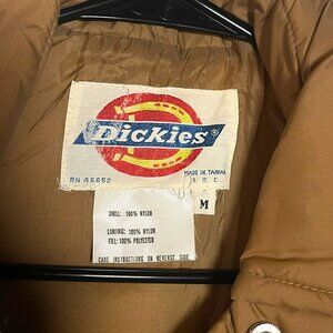 Classic Dickies quilted work vest in caramel/tan with snap front and four utility pockets. Made in Taiwan R.O.C. nylon shell, nylon lining, poly fill. Fits like Men’s Medium—see measurements. Flaw: light discoloration marks near lower placket/hem (see photos). Clean overall and priced with flaw in mind.
