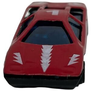 This vintage diecast toy car features a striking red body with distinctive silver lightning bolt decals and the number "1" prominently displayed. The sleek supercar/sports car design includes blue-tinted windows, a black lower chassis, and silver spoke wheels. This collectible miniature vehicle shows the craftsmanship typical of 1980s/1990s diecast toys with its aerodynamic wedge shape and detailed styling. Bottom stamped "MADE IN CHINA." Perfect for collectors of vintage toy cars, diecast vehicles, or racing memorabilia. The compact size (approximately 3 inches long) makes it ideal for display in collections. Shows light play wear consistent with age while maintaining its vibrant red finish and crisp silver graphics.