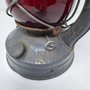 This lantern measures approximately 13 inches tall, 7 inches wide, and weighs about 2 lbs 13 oz. The red glass globe is intact with no cracks. The lantern shows some oxidation and surface wear from age, but there are no holes in the body. The cap opens and closes properly. It is untested and offered in as-found vintage condition.