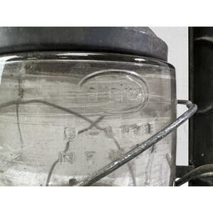 It measures 13.5″ tall (excluding the wire bail) with a 7.5″ diameter cast-iron base. Surface rust and wear are consistent with age and usage, giving it an authentic industrial patina.