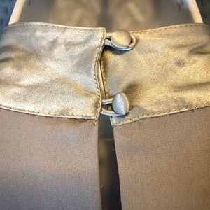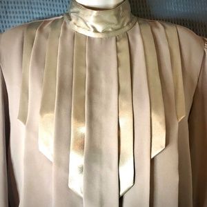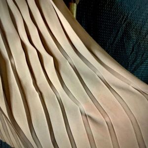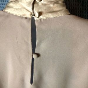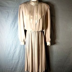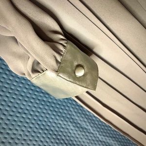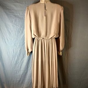 In a word--DANG! This is another one of those gowns that deserves to be framed--the bodice is so exquisite and unique that it almost seems like the work of an architect. Major Chrysler Building vibes, and the choice to pair the opaque silver with a gauzy and delicate pale grey is genius. The play on hard and soft is breathtaking--adore that the cuffs and the collar carry the theme, and the pleated skirt and billowing sleeves take it to a fashion forward place. Love, love, love the cloth buttons, the high neck, and the slightly naughty peek-a-boo back. Dim The Lites Petites is a line that I'm not that familiar with, but I will definitely be on the lookout for more. Size 8--the waist is elastic and has a lot of give. The dress measures 43 inches in length, the sleeves are 25 inches, and the bust is 18 inches from pit to pit. I tried to capture the sheer of the fabric in picture number 9, but I promise that it is tasteful and immaculately crafted. This is truly a piece of art.