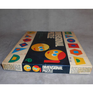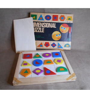 Vintage Dimensional Puzzle Europlastic Amsterdam Holland Montessori. A fun way to learn geometric shapes and primary and secondary colors. Comes in original box with direction sheet. The puzzle is in great shape. The box has some wear and has been repaired. It does have nice retro graphics on the lid. Please see pictures.