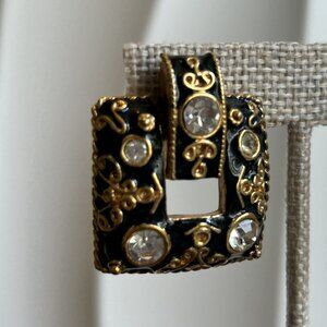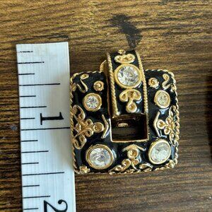 Materials: Black enamel, gold-tone detailing, clear rhinestones