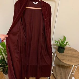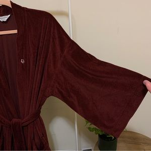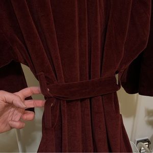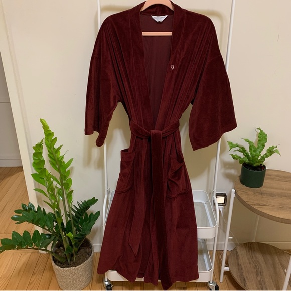 Ooh la la! This vintage velour Dior Monsieur robe is everything. Monsieur is just a serving suggestion. This would look fabulous on anyone. The deep burgundy color is gorgeous, and it’s in excellent vintage condition. Clean and NO flaws, signs of wear or odors. “One Size” and has two layers of belt loops to accommodate different heights. Belt is included. No fabric tag, but I’d guess polyester.